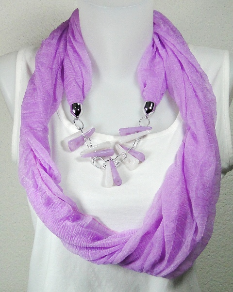 Echarpe foulard parme avec bijou assorti décor boutons en forme de dent.