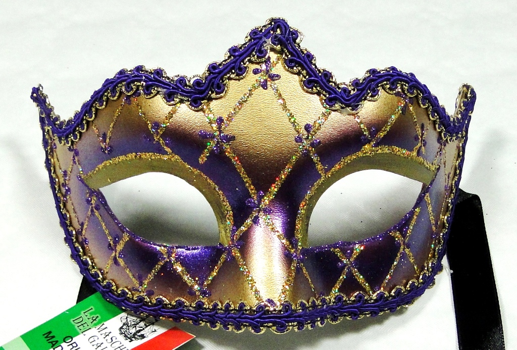 Véritable masque de Venise à porter en forme de loup Colombine pointe de couleur violet et doré.
