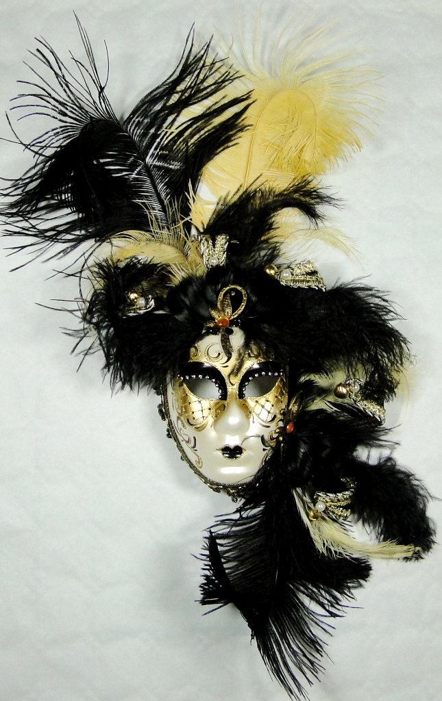 Véritable masque vénitien mural avec plumes et pointes petit modèle de couleur noir, champagne et doré.