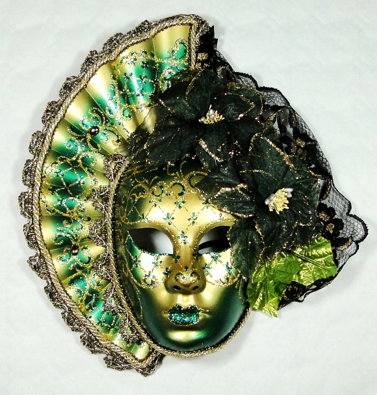 Véritable masque vénitien mural et à porter visage motif fleurs éventail de couleur vert et doré.