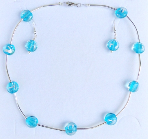 Parure verre MURANO 2 pièces, collier pastilles bleu et argenté et boucles d’oreilles pendantes assorties.