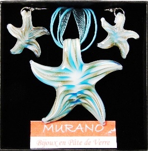 Parure verre MURANO 2 pièces, pendentif et boucles d’oreilles pendantes assorties, étoile blanche rayée bleu ciel et cuivré.