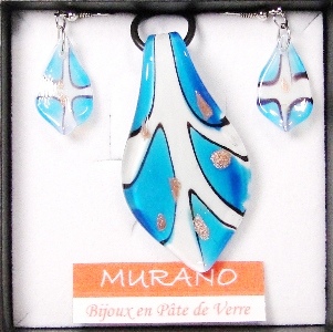 Parure verre MURANO 2 pièces, pendentif et boucles d’oreilles pendantes assorties, feuille blanc et bleu clair.