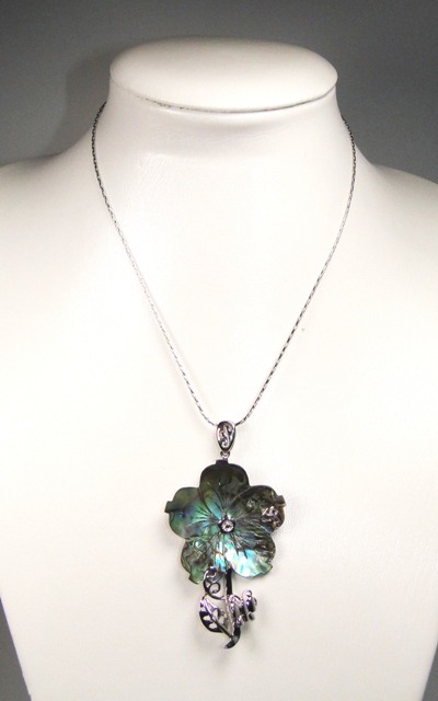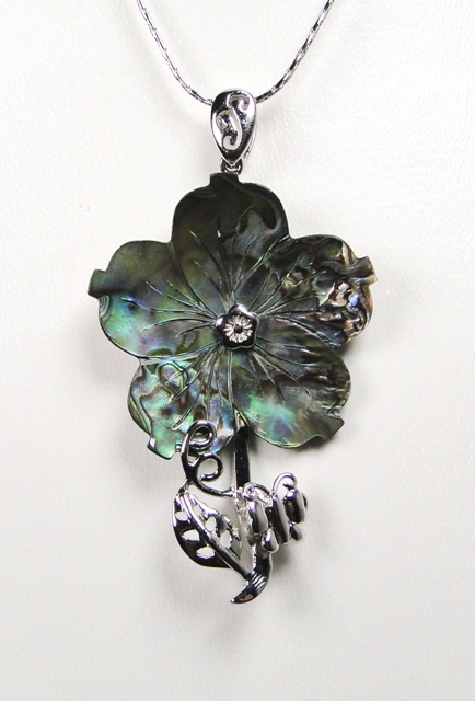 Pendentif fleur nacre abalone (reflets vert bleu) métal argenté monté sur chaîne plaqué chrome d’une longueur de 42 cm.