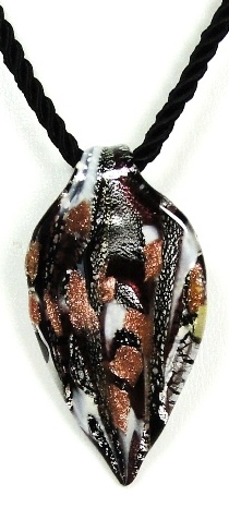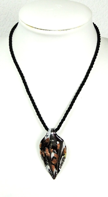 Pendentif verre MURANO feuille noir argenté blanc cuivré monté sur cordon torsadé noir d’une longueur de 45cm.