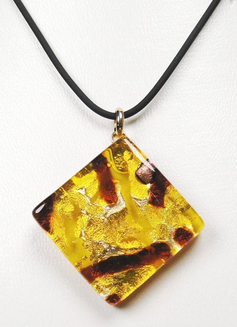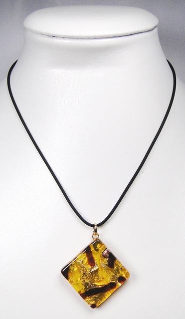 Pendentif verre MURANO losange grand modèle ambre marron monté sur cordon caoutchouc noir d’une longueur de 43cm.