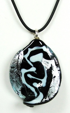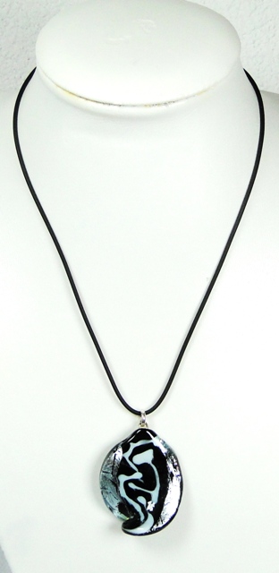 Pendentif verre MURANO tordu noir blanc argenté monté sur cordon caoutchouc noir d’une longueur de 44cm.